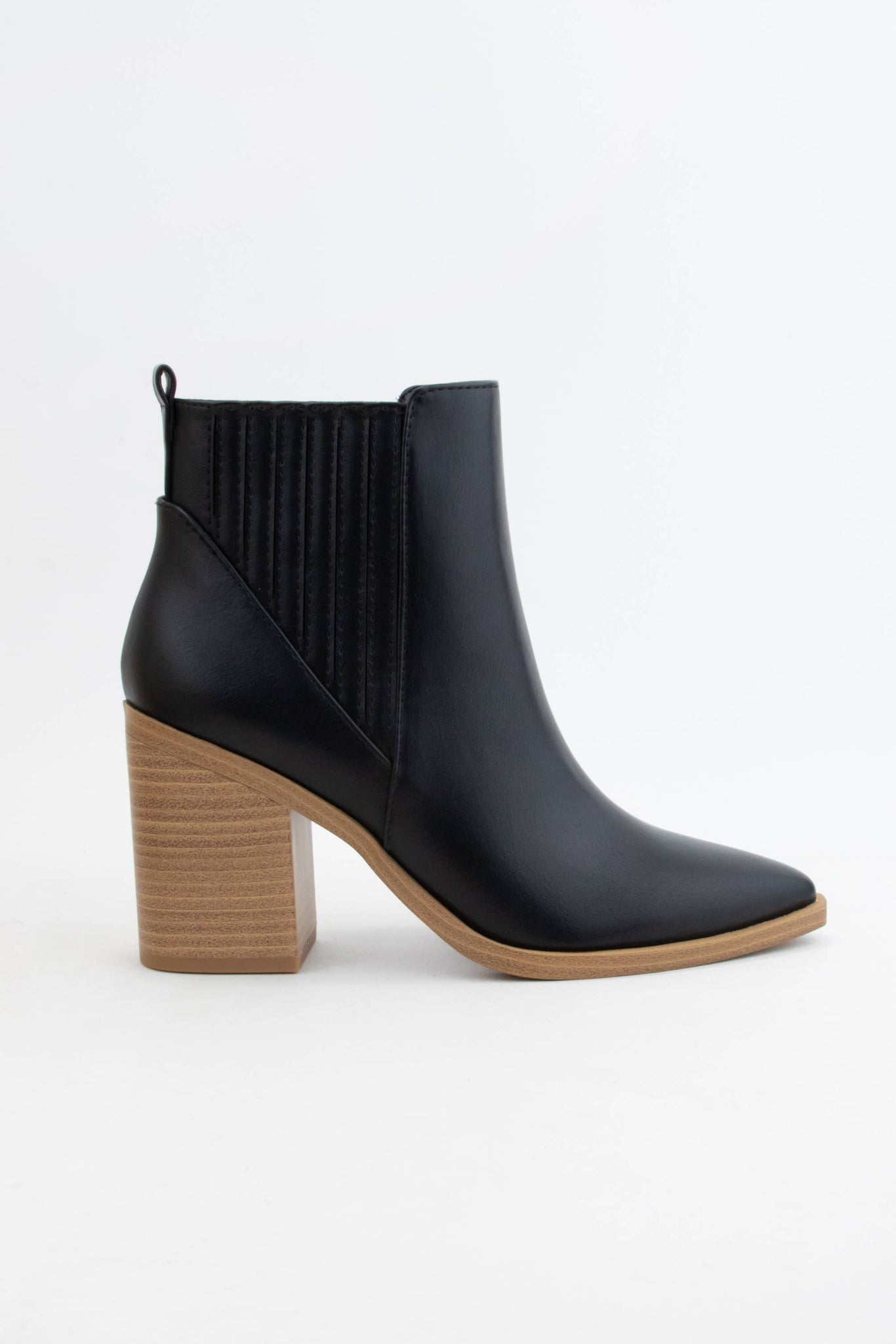 POINTED-TOE BLOCK HEEL CHELSEA BOOTIES: BLACK