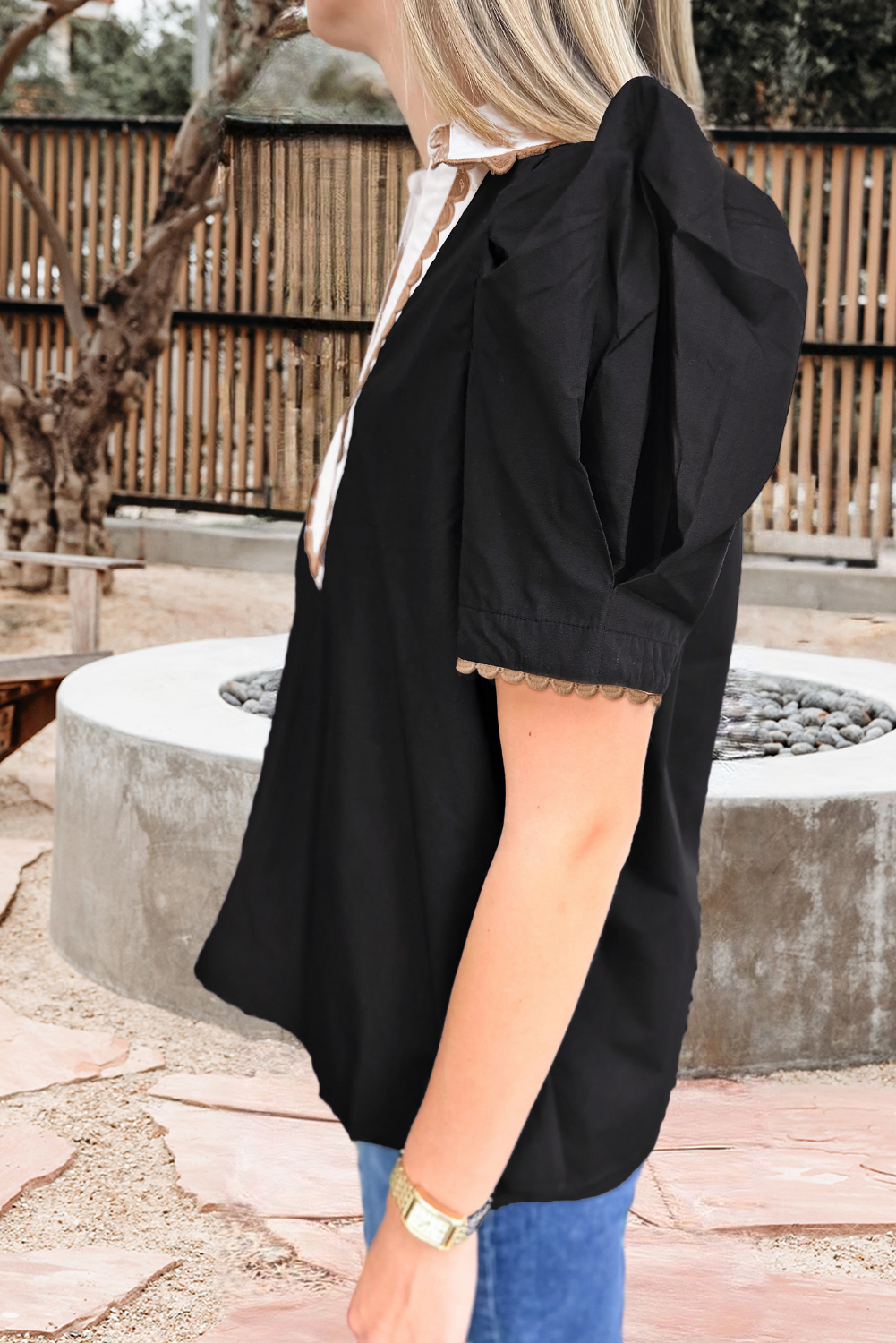 Ricrac Trim Collared Short Sleeve Blouse